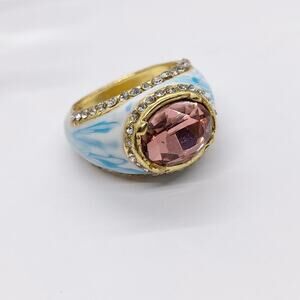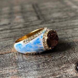 Features: gold plated stainless steel, swirled blue and white enamel, rhinestone edges and purple faux gemstone