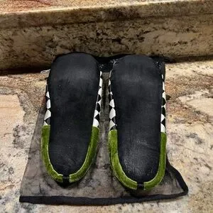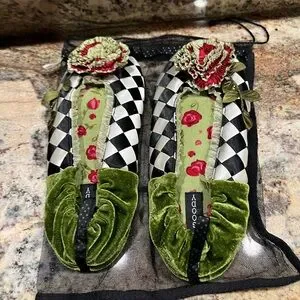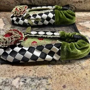 Step into style with these chic checkered slippers, featuring a bold floral design. Perfect for adding flair to any casual look. Colorful, Mackenzie-Childs look. Gorgeous! Comes with original bag. Great Christmas gift for someone who loves unique, beautiful things. Satin and velour with cushion bottoms. These don’t fall off your feet and are soooo comfortable.
