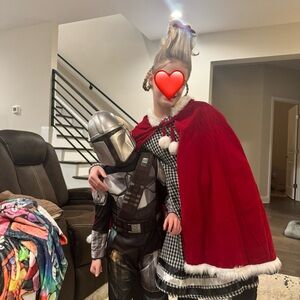 This kids costume features a vibrant red and white cape with checkered black & white dress.