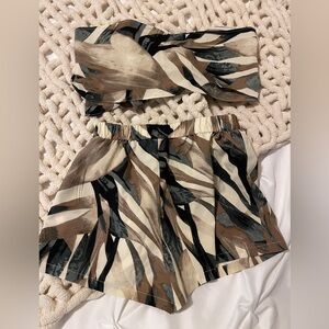 Two piece strapless tie front top and shorts. Tropical print. Great for vacation. Wore a couples times. Hand washed, hung to dry. No stains or tears. In like new condition. Tag cut off top piece so I wouldn’t come out while wearing.