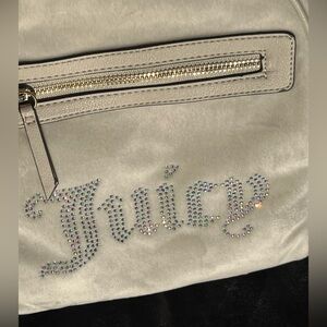 Features a large crystal "Juicy" logo in rhinestones across the front of the small zip pocket.