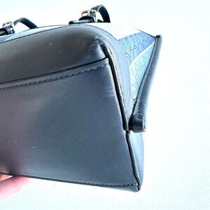Stylish Coach Mollie Tote in signature jacquard striped pattern and smooth leather. Features navy and light blue tones. Perfect for daily use.