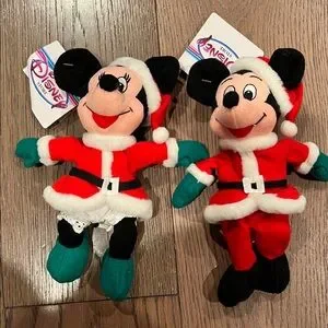 Charming Mickey and Minnie in Santa outfits. Perfect for holiday fun. Soft and cuddly Disney magic.