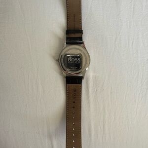 Stylish Hugo Boss watch with a black dial. Silver case and markers. Black leather strap.