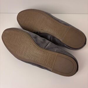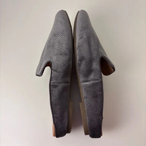 Experience the elegance of Vionic's gray mules, featuring a sleek almond toe and a minimalist design. Crafted from a textured material, these slip-on shoes offer both style and comfort.