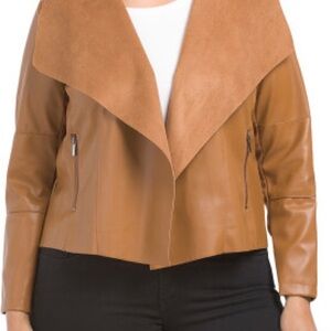 Features a faux-leather shell with soft faux-suede contrast on the inner lapels.