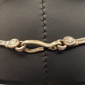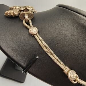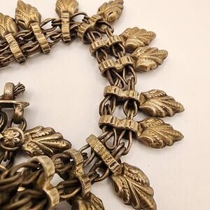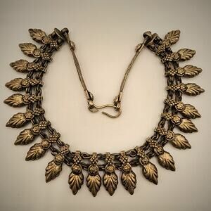 Magnificent antique gilt brass bib necklace dating to circa 1918–1930, crafted in the Austrian/Bohemian region during the transition from Art Nouveau to Early Art Deco. This hand-assembled piece features finely detailed leaf-and-berry dangles suspended from double foxtail-style chains and connected by rosette stations. The original hand-formed S-hook clasp and warm aged gilt patina attest to its early European workshop origins in the Gablonz/Austrian tradition.