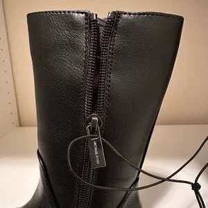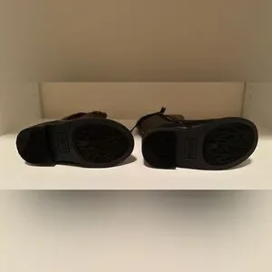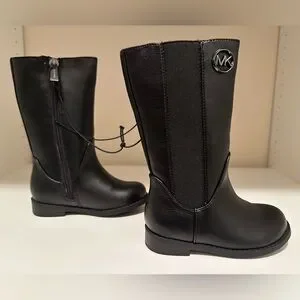 Black smooth leather with stretch fabric side and gunmetal hardware.
