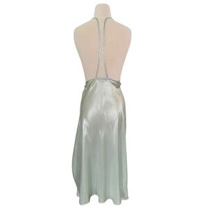 •ADDITIONAL INFORMATION: Halter style high neckline, lace racerback detailing, 17” side slit, sage green shimmer foil