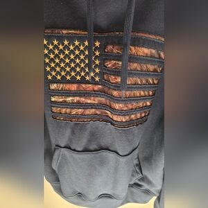Navy hoodie with a camo flag design. Features a cozy hood and front pocket. Ideal for casual wear.