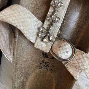 Bertula Birkenstock iridescent beige reptile prints Straps sandals with rhinestones accents EUR SZ40 pre owned in good used condition signs of wears on the straps has some peelings see all pictures any questions please message