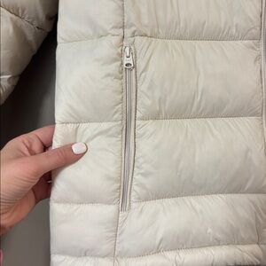 Perfect for those traveling or those who don’t want to wear a heavy coat. This is a cream colored lightweight packable puffer. It is wind resistant and water resistant fabric. Recycled filling. Size medium.