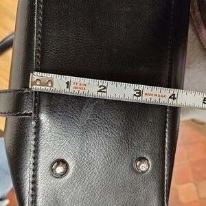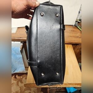 Myriam "MaryAm" Soft Black Leather Satchel Bag. Consists of 2 exterior magnetic closure pockets on either side. Sleek unpretentious style. Dual straps. Note edges of strap where hands grasped bag peeled. (Please review photos.) Straps on buckles so easily replaced. Top zippered closure. Spacious interior with center zippered compartment.