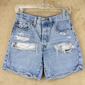 Stylish Levi's jean shorts. Light blue with distressed details. Classic five-pocket design.