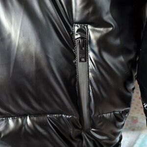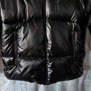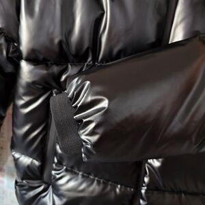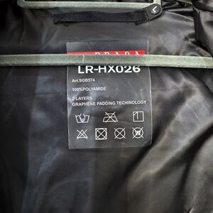 Glossy black fabric with fluffy quilting, hooded design with drawstring for added style, and a red ""PRADA"" logo on the chest for maximum brand recognition. The relaxed fit is perfect for streetwear and casual wear.