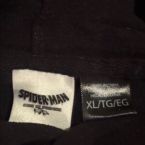 Bold black hooded sweatshirt featuring Spiderman logo. White text adds contrast. Back has Spider-Man logo. Ideal for Spider-Verse fans. Size: XL.