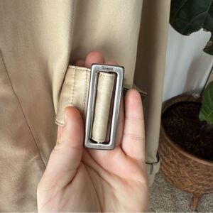 Elevate your outerwear collection with this timeless Coach Leatherware 1941 women’s trench coat in size XL. Crafted from 100% cotton with genuine leather trim details, this coat blends luxury with function.
