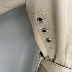 • Classic trench silhouette with belted waist & cuffs, coat closes in a single-breasted style, but the buttons are covered by an extra flap of fabric for a cleaner look.