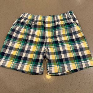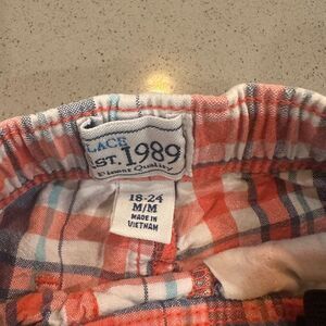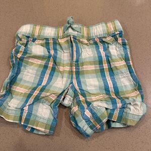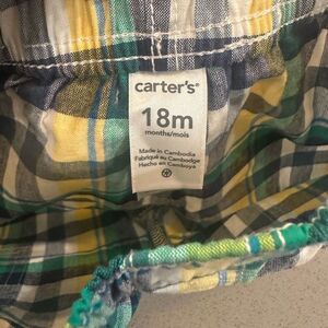 Blue of three adorablee baby boy shorts size plaid print shorts from Carters (size 18 months) first impression (18 months) which hasn’t been worn and a part of the tag is still on it, and children’s place (size 18-24 months). All are in excellent condition.