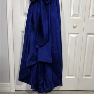 Stunning blue gown with floral lace details. Features a flowing skirt and elegant bow accent.