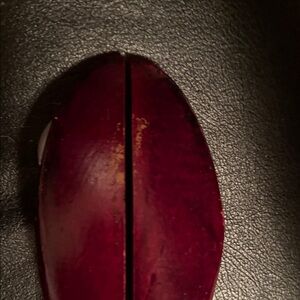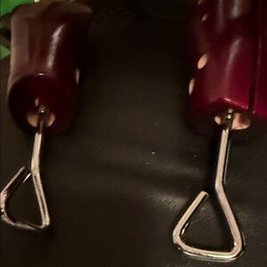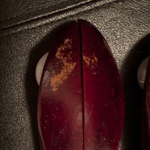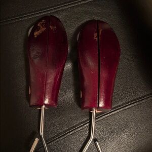 Elegant red wooden shoe trees with metal handles. Perfect for maintaining shoe shape. One of these didn’t open as well as the other