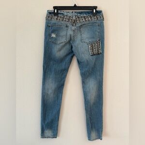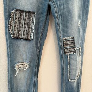 Stylish skinny jeans with patchwork details. Light blue wash. Ideal for everyday wear.
