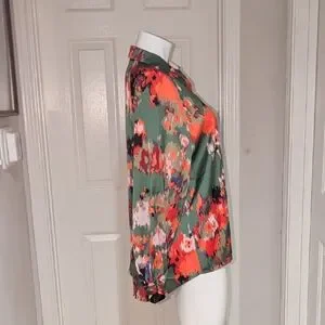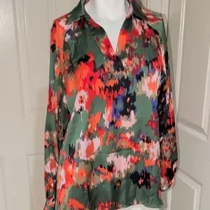 Make a statement with this vibrant abstract blouse. Featuring a stunning mix of red, green, and black, it's perfect for any occasion. No tags attached, synthetic blend.