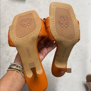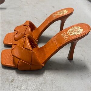 Vince Camuto sandals with a striking orange design. Woven texture adds flair. Perfect for a stylish look.❣️