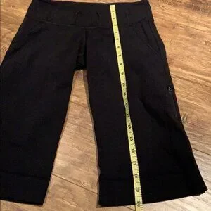 This is a nice black pair of Lululemon capris. They have the waist loops and a nice side pocket with a zipper. No size dot so please see measurements. They seem to measure like a size 2. They show some wash wear through minor piling and some paint chipped of the zipper. Otherwise great condition.