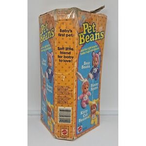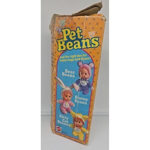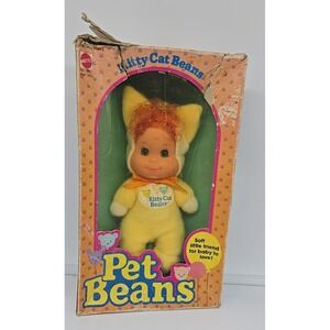This is a rare vintage stuffed animal toy produced by Mattel in 1983. The toy is a kitty cat bean and is likely part of a collection of vintage toys and hobbies.