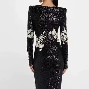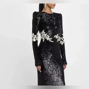 Perfect holiday event dress. Shine in this elegant black sequin dress, featuring exquisite floral accents. Perfect for evening events and special occasions. Beautiful piece perfect for the holidays. Would order two to three months in advance. Order early for your event 30 days made to order to make. Private client pricing available. Pre order only, shipping may take time. 11 to 15 business day or 30 business days for back order.