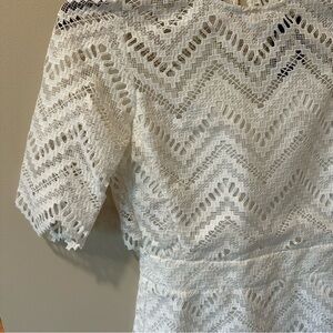 Featuring: Concealed button back, Zip closure, Round neck, Short sleeves, Straight silhouette, All-over cut-out lace, Structured waistband, Keyhole opening at back, Chevron like lace patterning, Partially lined, 100% poly; lining 100% cotton; 95% poly, 5% elastane.