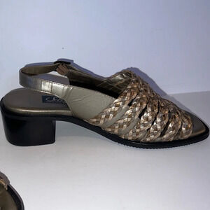 Selby, 7.5 2E, active flex, leather upper, 2 inch block heel, sling back adjustable ankle, braided two-tone gold and bronze metallic sheen leather, open toe sandal.