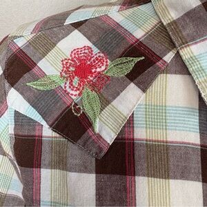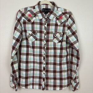 Shyanne Cotton Western Snap Front Brown Plaid Shirt Sz L Floral Embroidery Rodeo