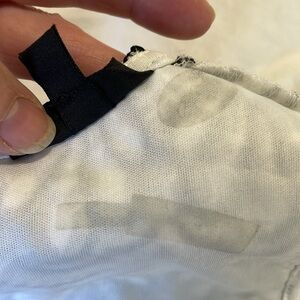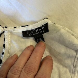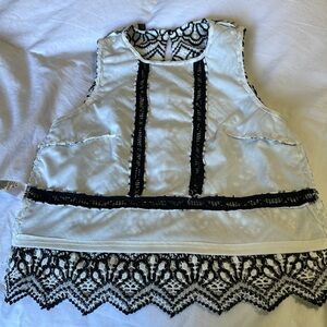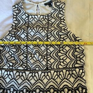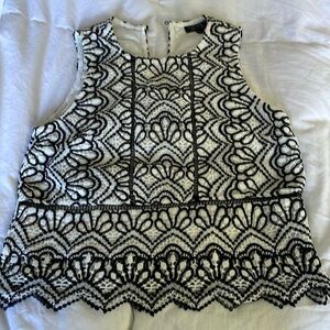 Topshop sleeveless top with embroidered overlay, scalloped edge, black and white, key hole buttoned back, fully lined, size 4. Has small mark inside on liner (see pics) from sticker, does not affect the outside appearance. Classic, quality staple piece, adds a touch of elegance to any outfit.