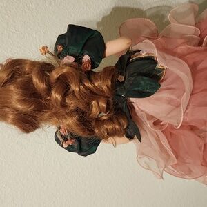 Beautiful doll wearing a pink ruffled dress with green floral accents. Perfect for collectors.