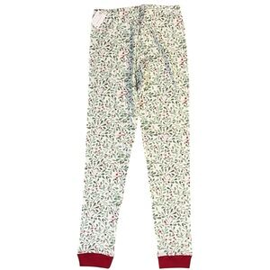 This Christmas pajama set is new with tags. It features a holly print design, an elastic waist, and ribbed-knit cuffs at the end of the sleeves and pant legs. The pants and top are supposed to fit snug.
