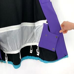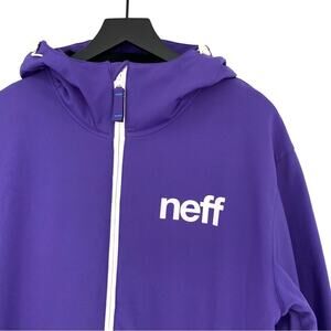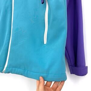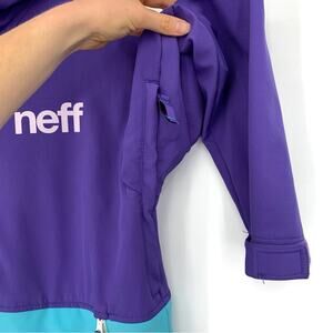 Neff Daily Softshell Jacket in a light teal blue and purple. Full zipper closure, velcro cuffs, attached hood with cinch fasteners. Two front pockets, zipper armpit vents. Fleece lined, zip out powder skirt with snaps. Great condition, besides some exterior spots.