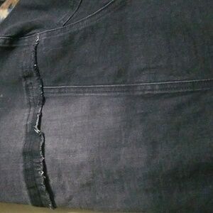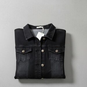 Chic black jean jacket with button front. Ideal for layering. Arm to arm 25 length 23. cotton 63 polyester 35 Spandex 2. 2 slit pockets button down closure. Raw hem