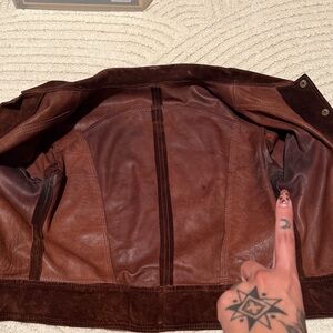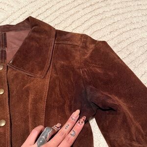 Vintage brown suede jacket. Has no tags best fit size small(see measurements). Spots throughout on elbows under arms, and collar.(see photos.) still a great jacket, beautiful color lots of life left. not lined. I purchased this used and have never worn. (Can be professionally cleaned)