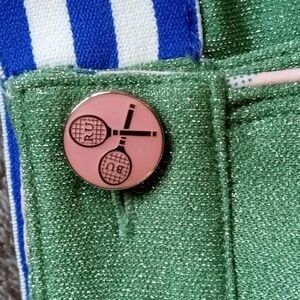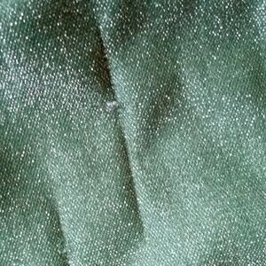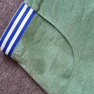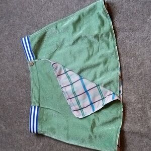 Wraparound skirt with two side pockets and blue and white stripe elastic waistband. Fully reversible with green Lurex on one side and pink plaid on the other. Some snags in the Lurex side as shown.