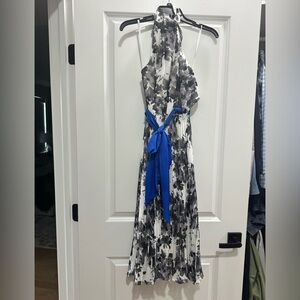 Floral Pleated Halter Maxi Dress size 8with Blue Sash Tie