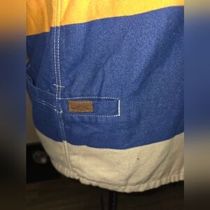 This bold and colorful California Cowboy flannel shirt jacket is designed for adventure. Features their signature heavyweight brushed flannel, waffle-knit lining for warmth, snap-button closure, chest pockets, and premium retro-inspired color-blocking in orange, yellow, blue, and cream.