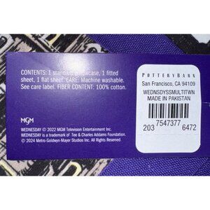 The NWT Pottery Barn Wednesday Halloween Twin XL Sheet Set features a unique design inspired by the Addams Family, specifically the character Wednesday. The multicolor sheet set includes pillowcases and is machine washable for easy care. Perfect for adding a touch of whimsical charm to your bedroom, this set is ideal for fans of the Addams Family or those looking to bring a playful and quirky theme to their space.