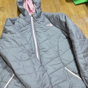 Quilted gray jacket by The North Face. Features a pink lined hood and zipper accents.