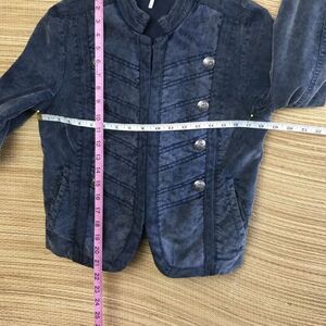 Marching band-inspired washed corduroy military velvet jacket. Button appliques along bodice and four hook-and-eye closures. Hip pockets. Fully lined. Rare find. Looks new or worn once condition. Size S Please use my photos as part of description. Due to different camera and light color of the item can be slightly different.