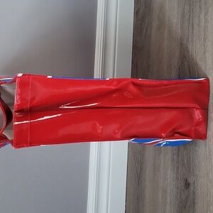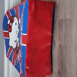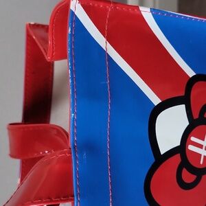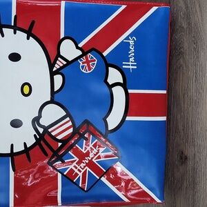 Adorable limited-edition Harrods tote featuring Hello Kitty in a blue Union Jack dress holding a matching Harrods shopping bag. Glossy red, white, and blue PVC finish with sturdy red patent-style handles. Perfect for travel, shopping, or as a collectible piece for Hello Kitty or Harrods fans!