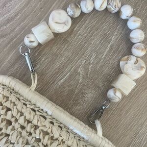 Chic and stylish beige woven handbag featuring a unique beaded handle. Perfect for adding a touch of elegance to any outfit.