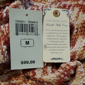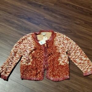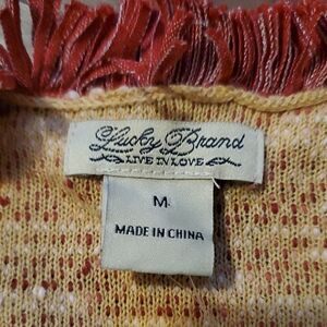 Lucky Brand Red and Cream Marled Pattern Fringe Trim Open Front Cropped Cardigan