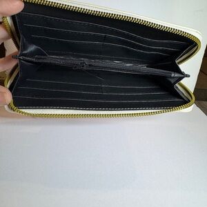 Cute Hello Kitty wallet. Features a playful design. Perfect for fans. Brand New wallet. Measures approximately 7 1/2 inches by 4 inches in width. Has three compartments, with slots for 12 card slots, a zippered coin, and an area for bills.
